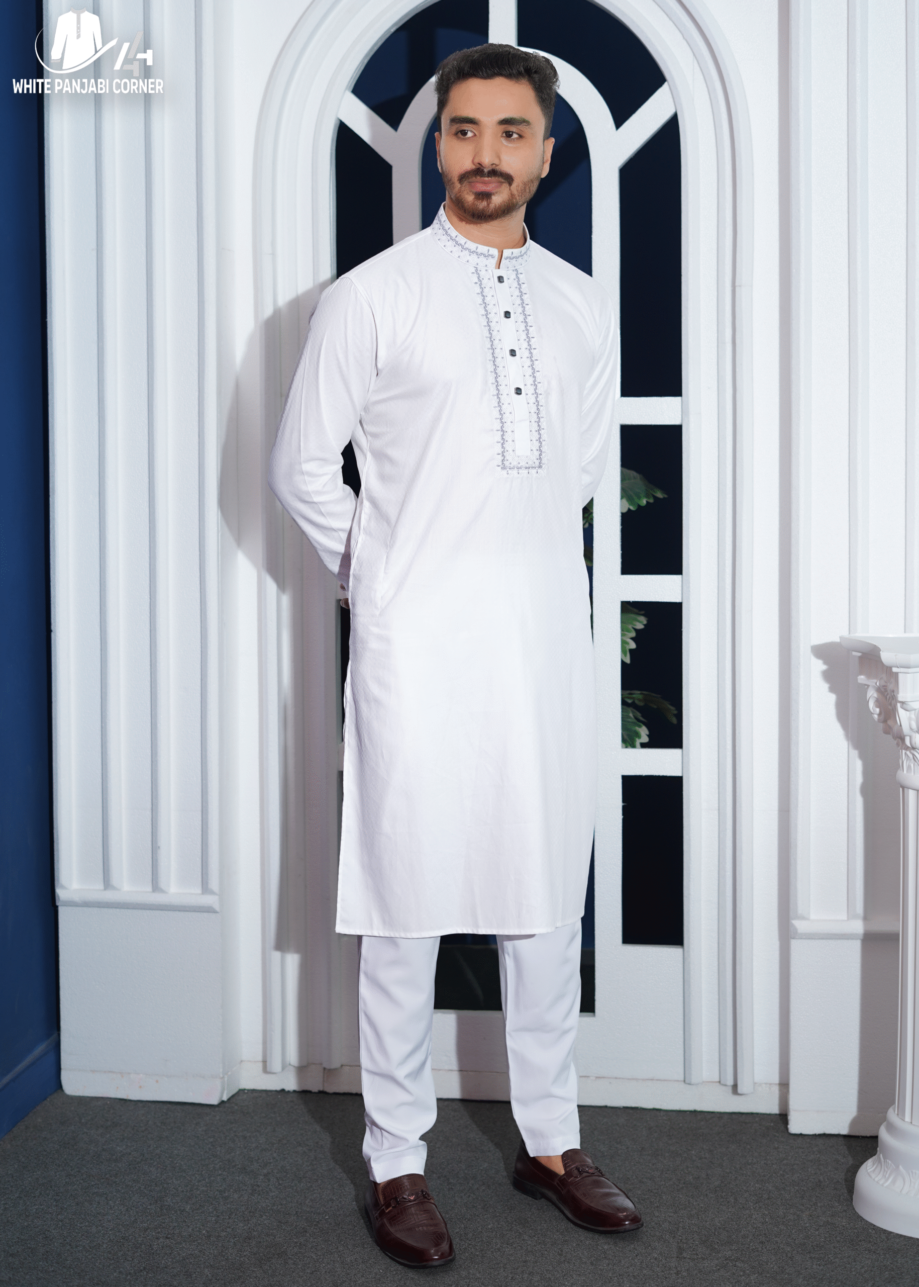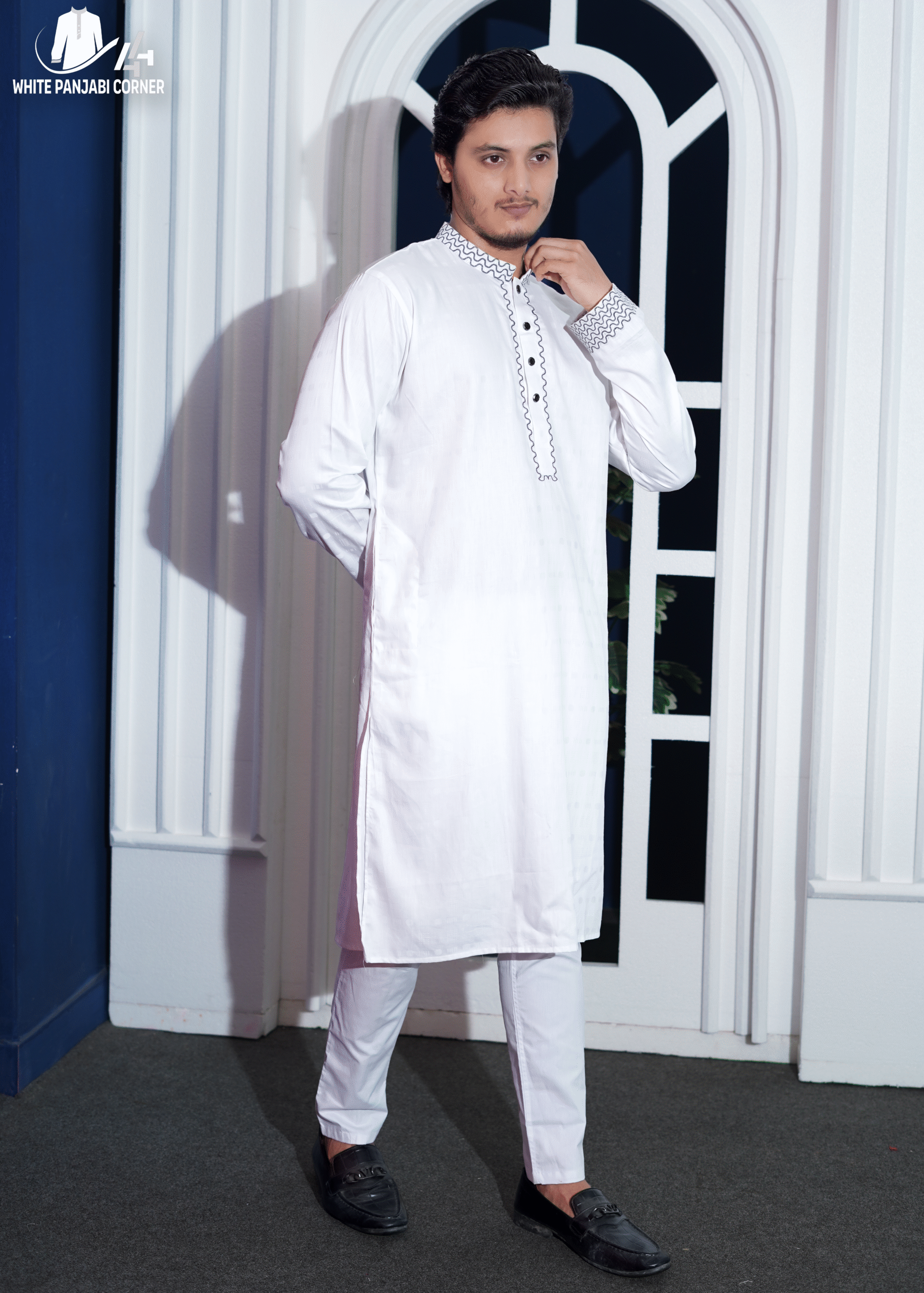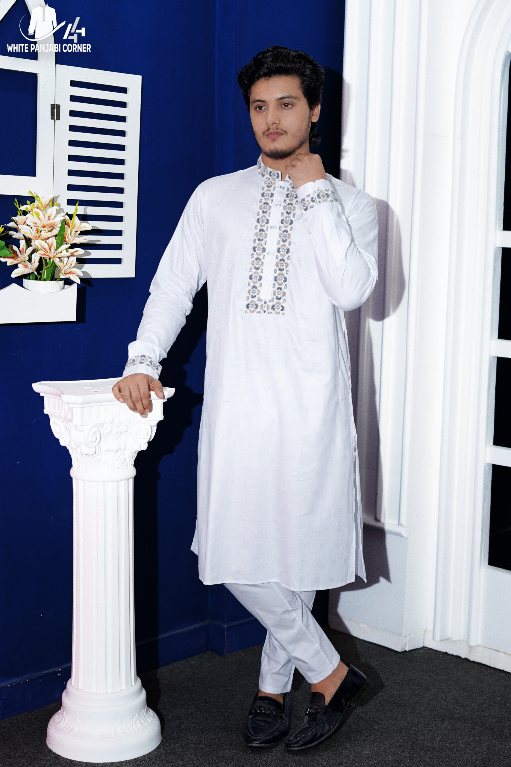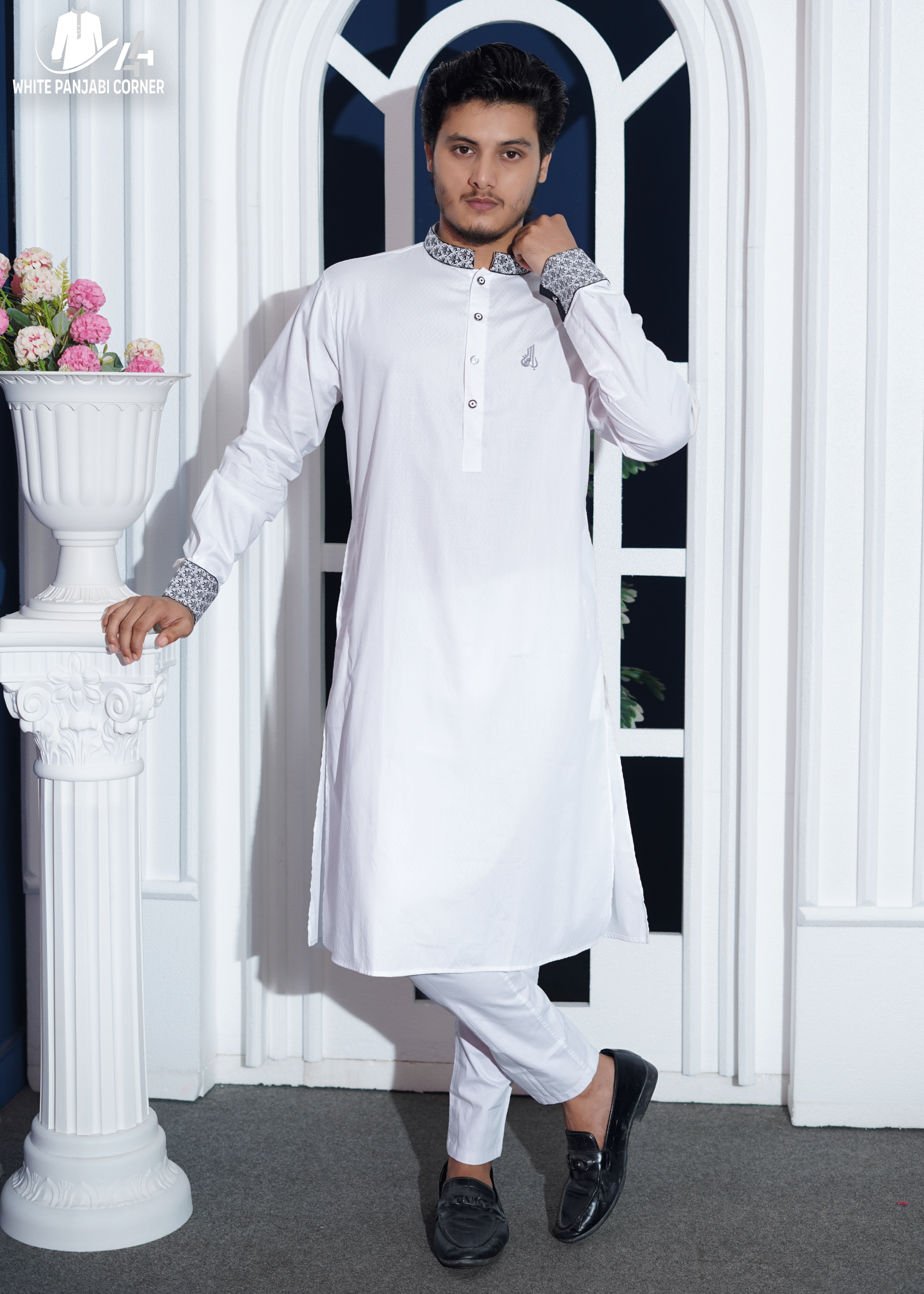 Pure White Premium Cotton Collar And Cuff Embroidered Panjabi
