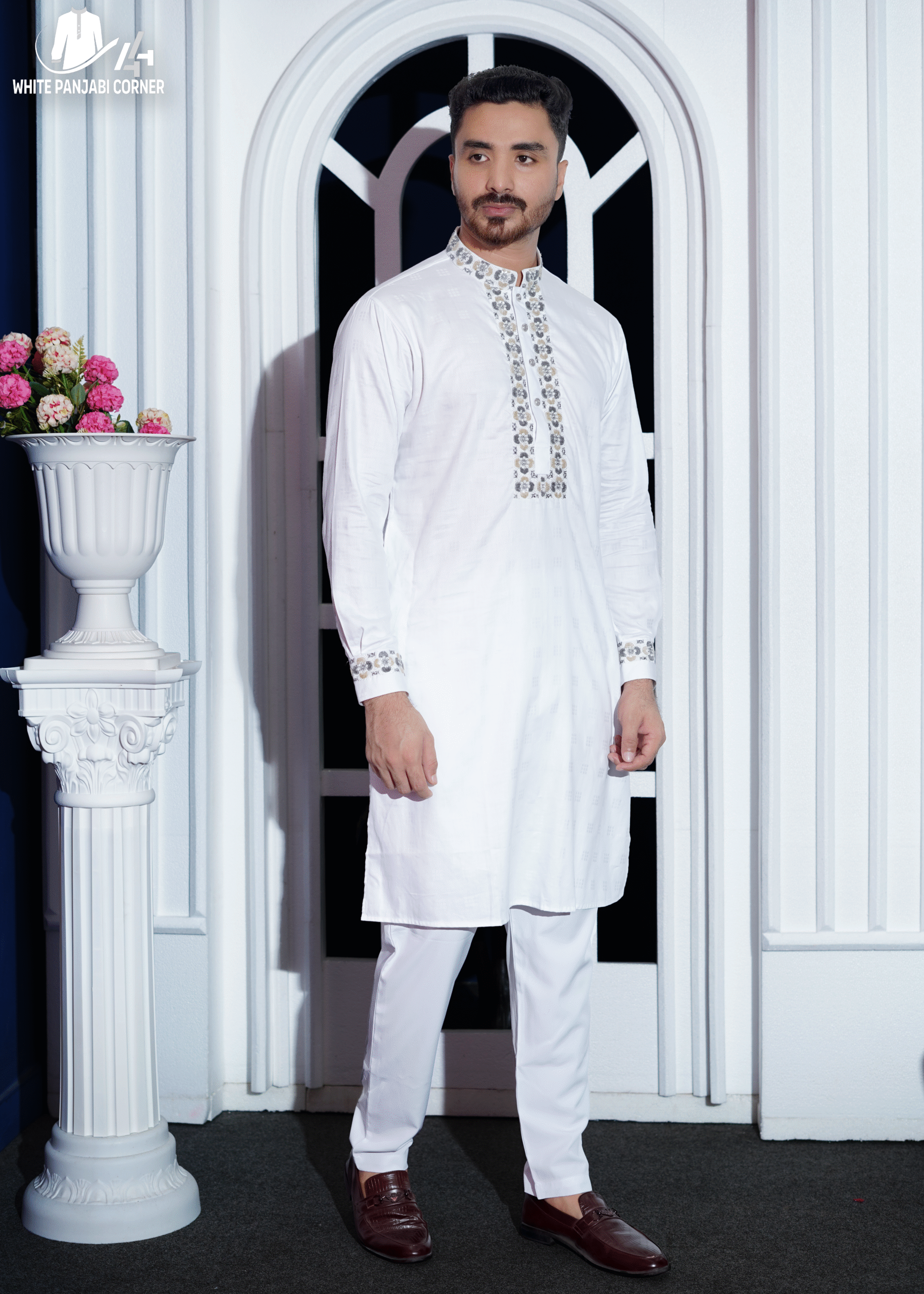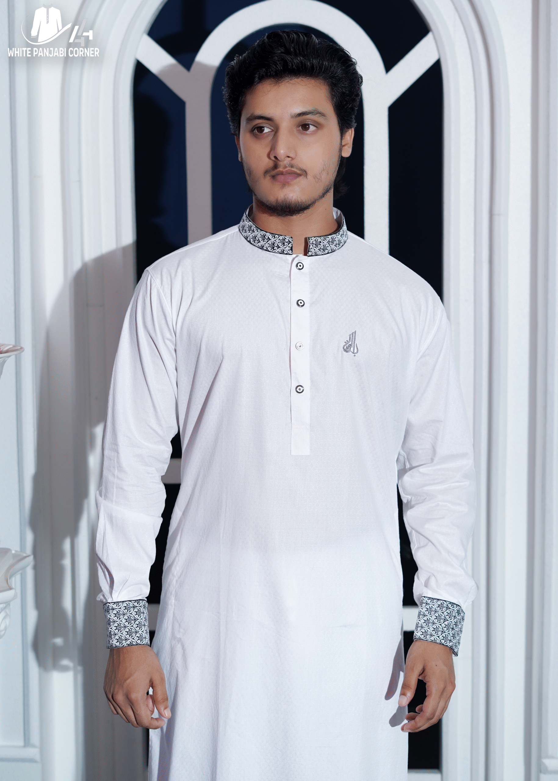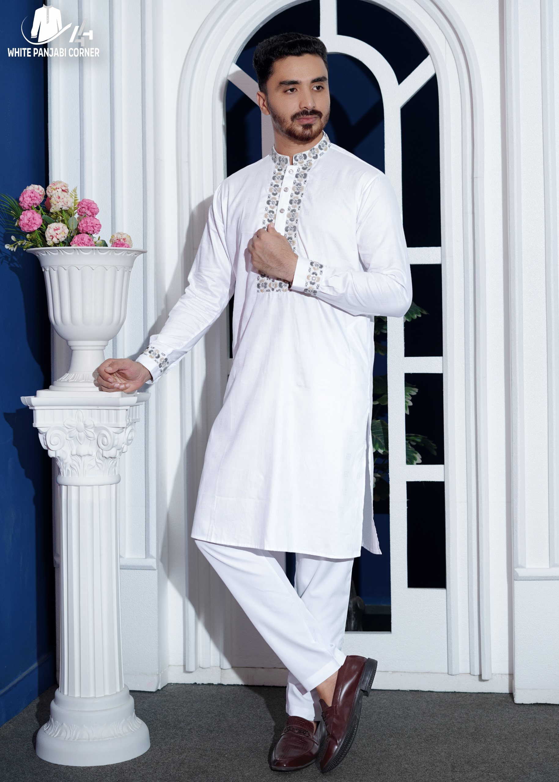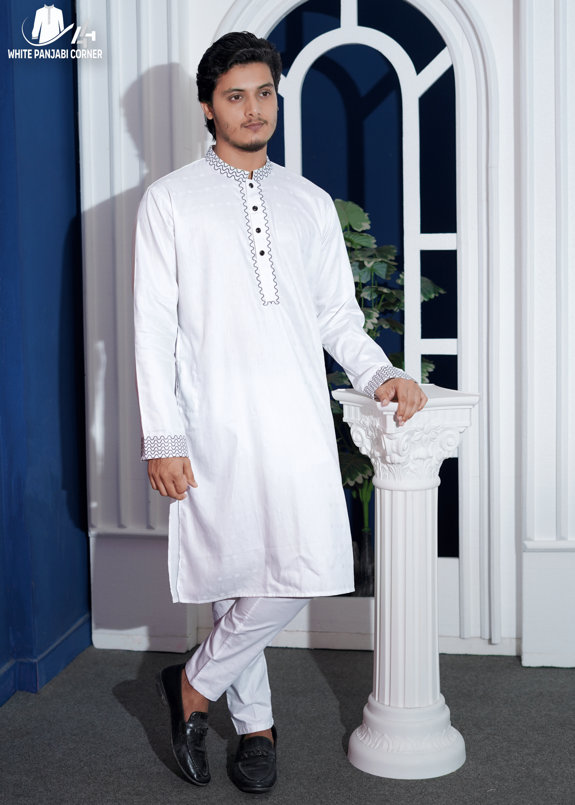 Pure White Premium Cotton Collar And Cuff Embroidered Panjabi
