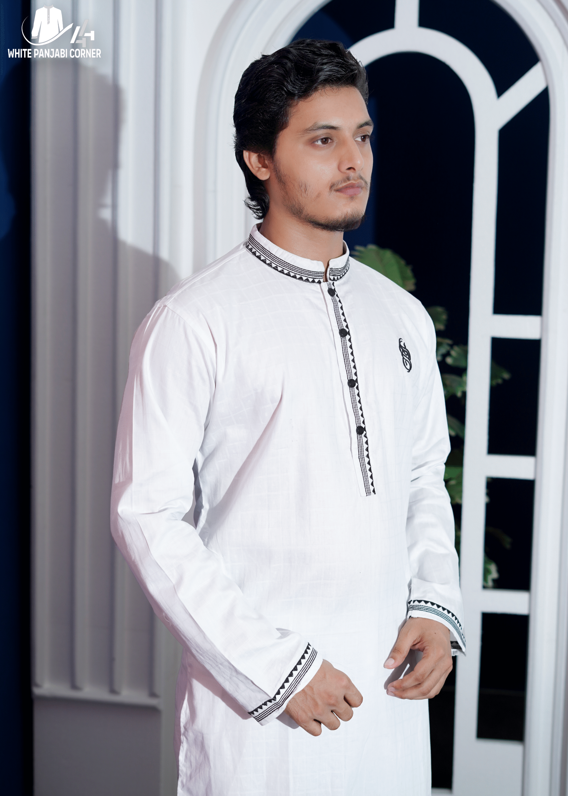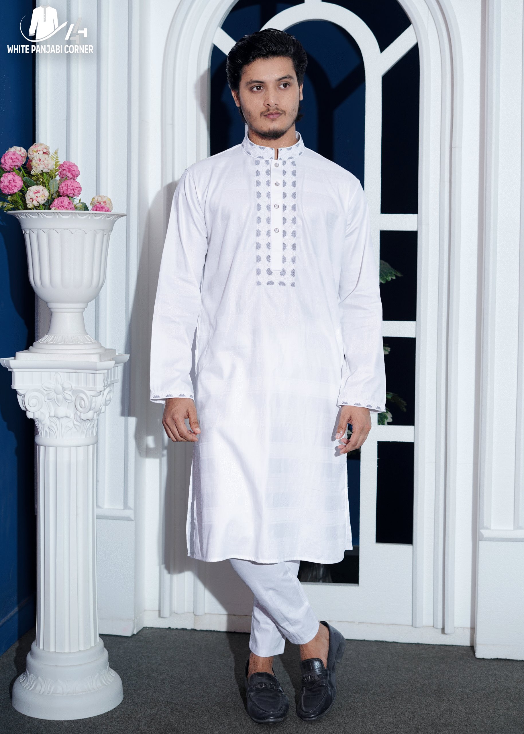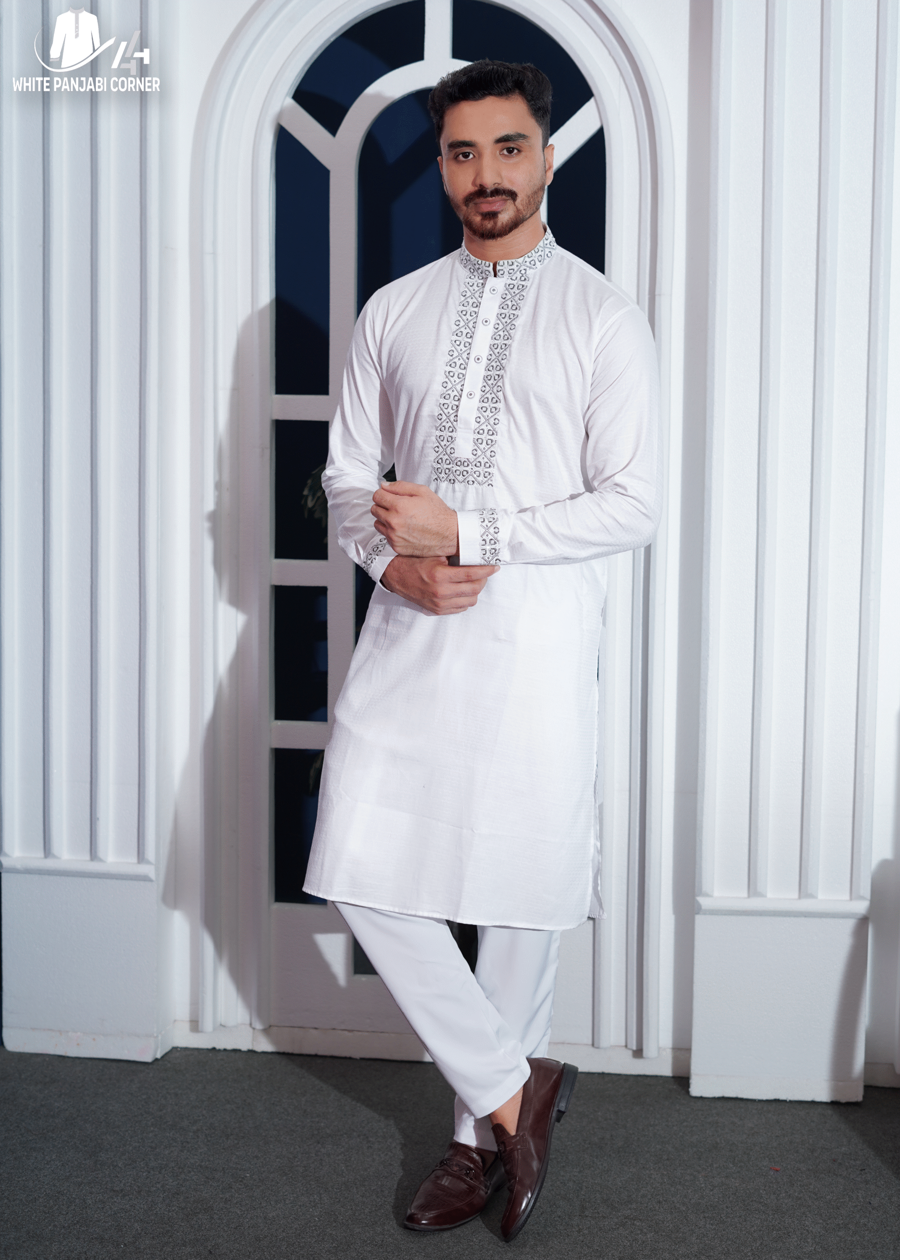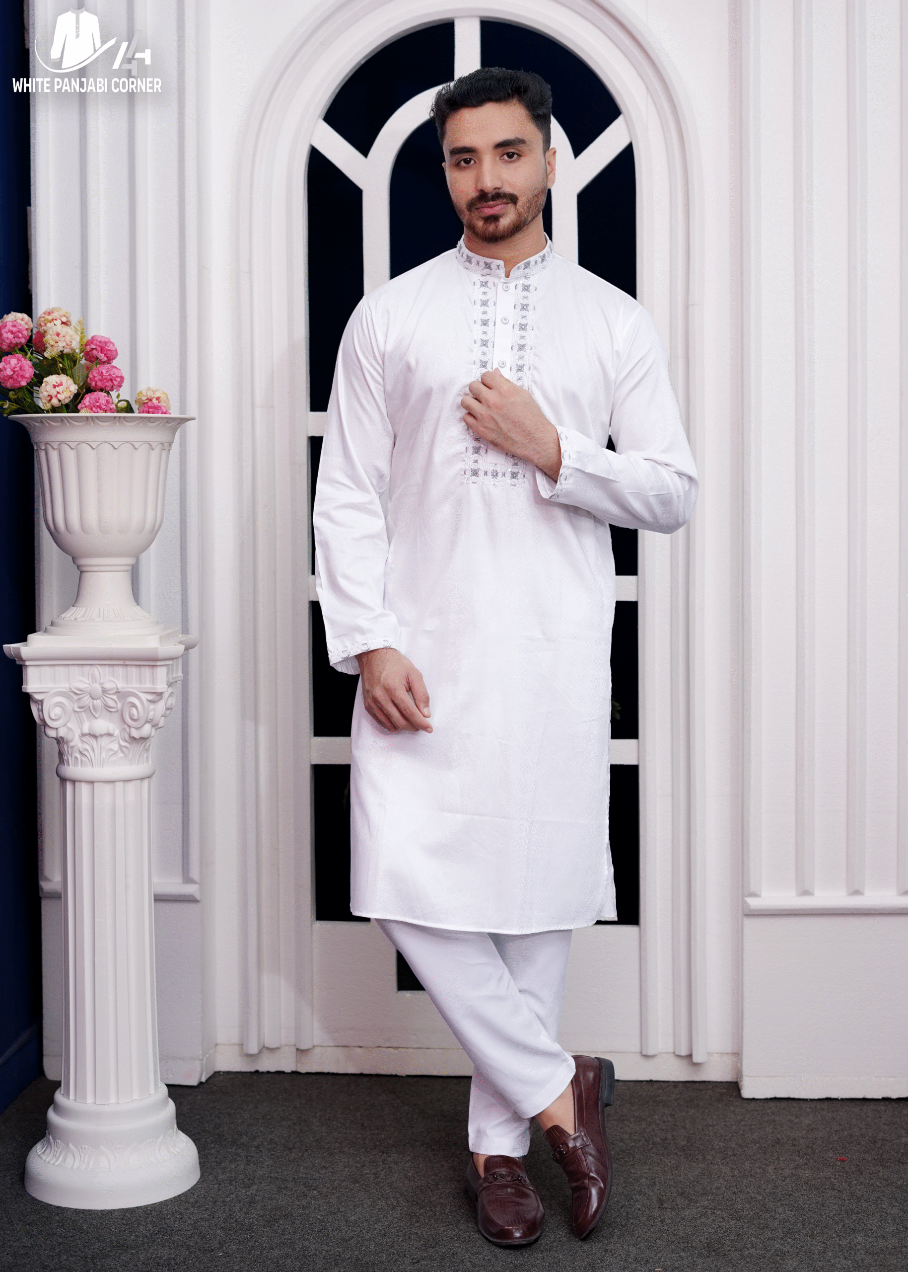 Pure White Premium Cotton Collar And Cuff Embroidered Panjabi