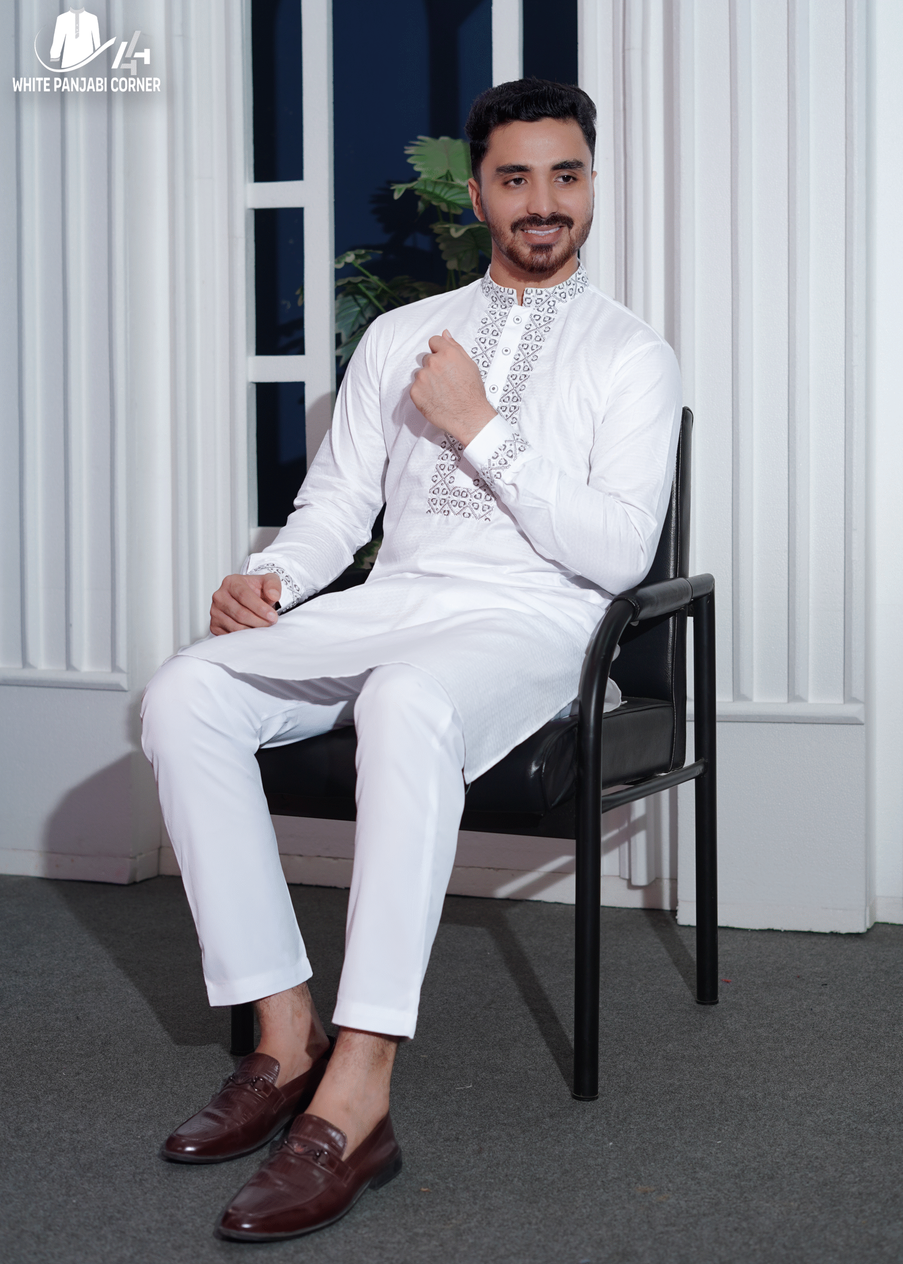 Pure White Premium Cotton Collar And Cuff Embroidered Panjabi