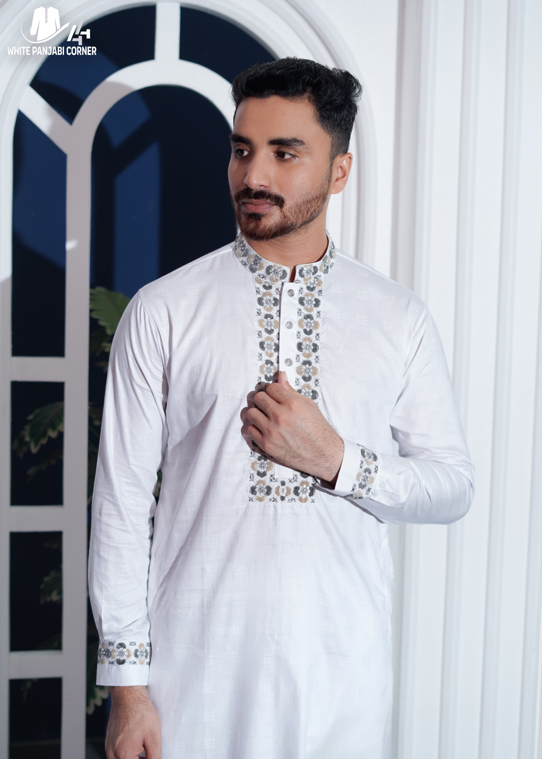 White Premium Cotton Floral Embroidered Panjabi